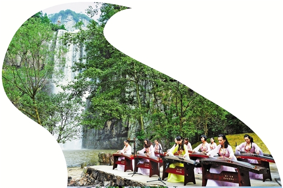 文成百丈漈景区中正在举办文艺表演,侨家乐带动了当地乡村旅游的发展。