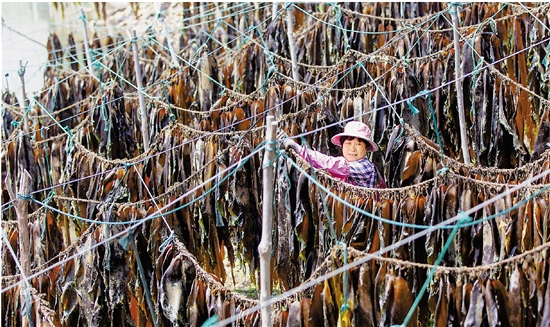近日,宁波市象山县黄避岙乡西沪港沿线的海带养殖基地迎来了丰收。养殖户们趁着天气晴好,忙着采收、搬运和晾晒海带。图为4月30日,在黄避岙乡白屿村的晾晒点,养殖户正忙着给晾晒的新鲜海带翻面。 本报记者 贺元凯 拍友 王琮 摄 |