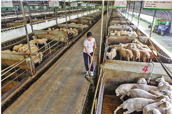 唐红正在给湖羊投喂饲料。