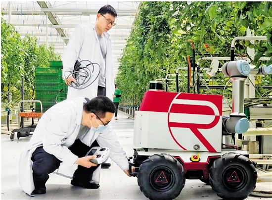 研发人员在山东德州的阳光大棚内对西红柿采摘机器人做现场测试。