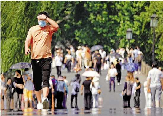 5月10日下午,杭州西湖白堤路面在阳光直射下泛起热浪,游客纷纷撑起遮阳伞。刚刚入夏第四天的杭城气温一路飙升,最高气温达到35.8℃,迎来今年的首个高温日。