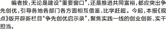 编者按:无论是建设“重要窗口”,还是推进共同富裕,都应突出争先创优,引导各地各部门各方面相互借鉴、比学赶超。今起,本报《观点》版开辟新栏目“争先创优启示录”,聚焦实践一线的创业创新、实干担当。
