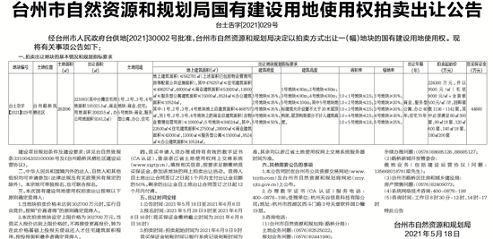 台州市自然资源和规划局国有建设用地使用权拍卖出让公告