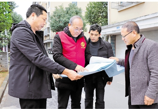 义乌市苏溪镇六都村“第一书记”楼启书(左二)与村两委干部现场审核绿化区规划图。