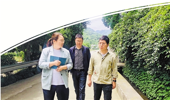 记者何伊伲(左一)跟着工作人员探访新建村。 本报记者 郑元丹 摄
