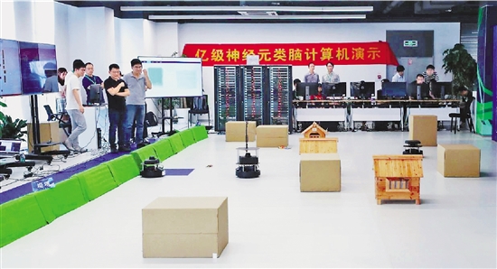 之江实验室联合浙江大学研发的我国首台类脑计算机正在演示机器人协同抗洪抢险。 之江实验室供图
