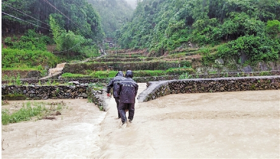 开化县芹阳办事处五丰村部分农田被淹,村里的党员徐崇渭、徐永禄正在防洪堤上巡查、排险。 芹阳办事处供图