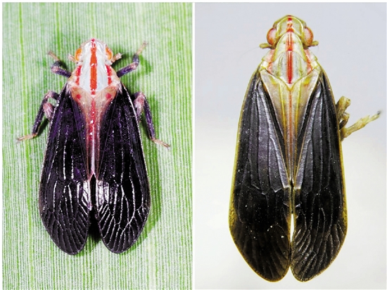 泰顺带扁蜡蝉活体(左)和标本。
