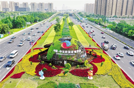 第二届中国—中东欧国家博览会暨国际消费品博览会将于6月8日起在宁波举行。该市多个广场和主要道路附近设置了30多处花境,为甬城新添花样风情。图为6月2日,宁波世纪大道沿线的主题花境。