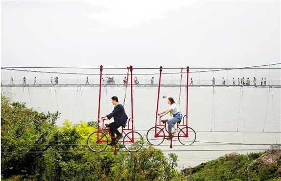 上栈头村的高空自行车项目很受年轻游客欢迎。 拍友 王萍晓 摄