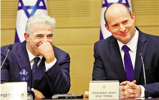 6月13日,以色列新任总理贝内特(右)和候补总理兼外交部长拉皮德参加新一届政府第一次内阁会议。 新华社发