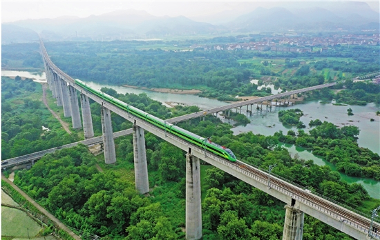金台铁路上,一列“绿巨人”动车组正驶过田市跨永安溪特大桥。 拍友 王跃国 摄