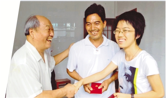 高阿二的外孙杨辉军和他18岁的女儿杨希晨于2009年先后入党,徐永辉(左)前往祝贺。 浙江共产党员杂志记者 黄国中 摄