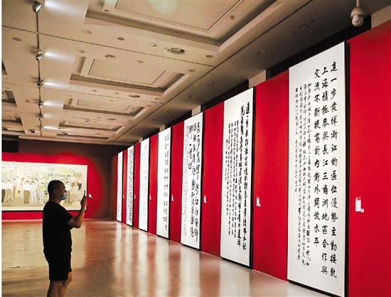 6月29日,百年辉煌——庆祝中国共产党成立100周年暨“百年追梦”浙江美术书法百件力作大展在杭州隆重启幕。图为市民在欣赏展览作品。 本报记者 周旭辉 摄