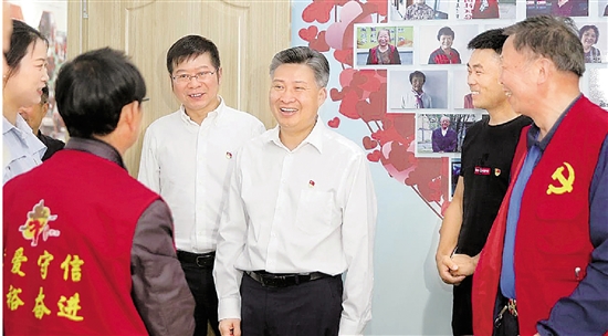 5月19日,沈铭权(中)在孝丰镇“幸福星期三”志愿服务中心与志愿者交流。