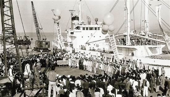 1983年11月,国务院批准台州海门(今椒江区)港对国际航线开放。1990年10月,国务院批准海门港对外轮开放。图为海门港开港仪式。