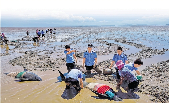 当地村民和救援人员救援瓜头鲸。 台州公安供图