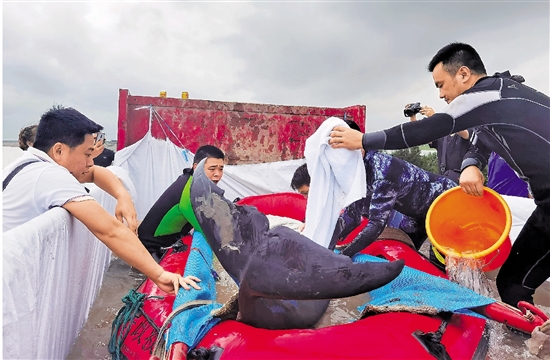 救援人员将货车改造成小型泳池,用来转运瓜头鲸。