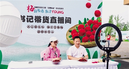 近日,第三届“三国梅语”文化旅游节在安吉县递铺街道三官村举办,村书记现场直播带货,帮助农户扩大销路,打响本地水果品牌。 王豆豆 摄/文
