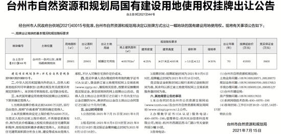 经台州市人民政府台供地[2021]40015号批准,台州市自然资源和规划局决定以挂牌方式出让一幅地块的国有建设用地使用权。现将有关事项公告如下: