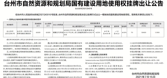 经台州市人民政府台供地[2021]40016号批准,台州市自然资源和规划局决定以挂牌方式出让一幅地块的国有建设用地使用权。现将有关事项公告如下: