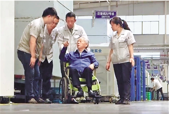 池幼章坐在轮椅上,在工作人员的帮助下巡视车间(资料照片)。