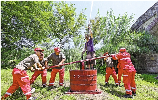 7月15日,武义县白洋街道白溪村,义务森林消防队正在操练有上百年历史的救火器械——铜铸“水龙”。每年农历六月初六,白溪人都要组织人力操练“水龙”,守护小山村乃至周边乡镇。 拍友 胡肖飞 摄