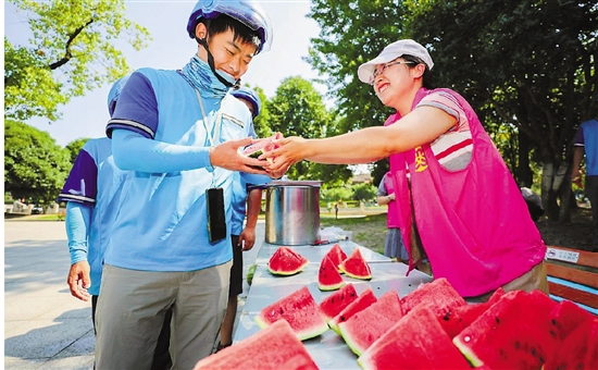 湖州市德清县武康街道的妇联志愿者将清凉汤、水果、防暑药品等送到外卖小哥手中。