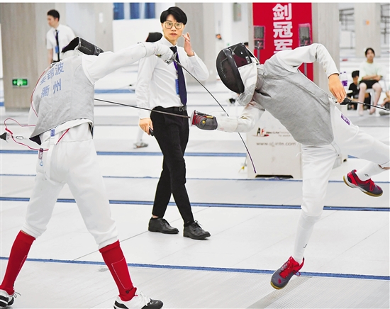 | 7月14日至16日,由省体育局主办的2021年浙江省青少年击剑冠军赛在杭州全民健身中心举行。来自全省各地市20支代表队的600多名小剑客参与花剑、重剑、佩剑个人赛和团体赛的角逐。 本报记者 董旭明 摄 |