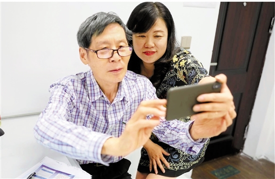许翯翯(右)教老人学习自拍。 拍友 吴昱燊 摄