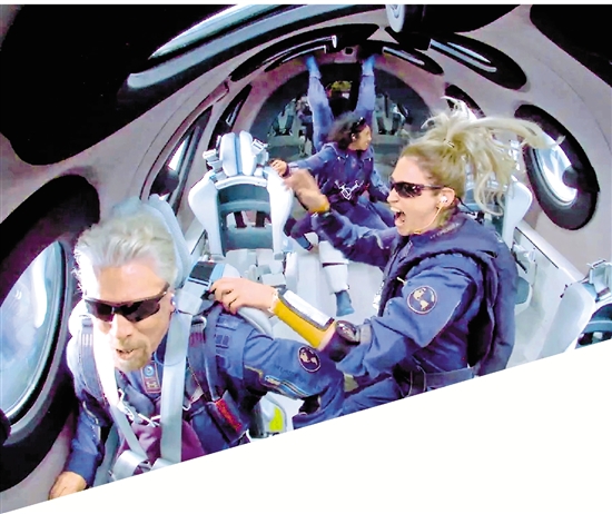 ◀ 7月11日,维珍银河公司创始人理查德·布兰森(前)在“团结”号太空船内体验试飞(视频截图)。 新华社发