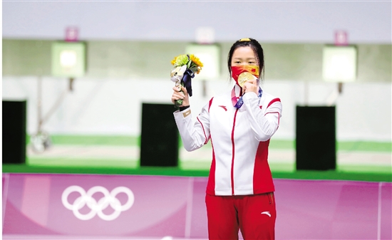 在7月24日进行的东京奥运会女子10米气步枪比赛中,中国“00后”选手、浙江小将杨倩扛住了压力,以决赛251.8环的成绩夺得冠军,拼下了东京奥运会首枚金牌。图为杨倩在领奖台上亲吻金牌。 本报特派记者 王建龙 摄 (相关报道详见第四版) |