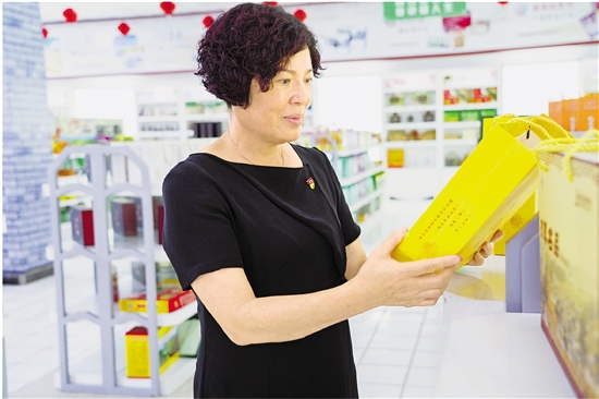 ◁裘银芳在“名特优商品购物中心”察看商品。