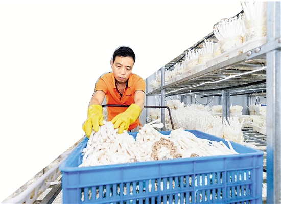 在金华市婺城区白龙桥镇上邵村,工人正在收获菌菇。 拍友 陈俊 摄