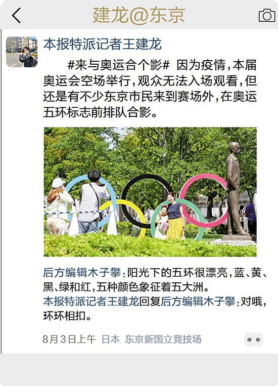#来与奥运合个影# 因为疫情,本届奥运会空场举行,观众无法入场观看,但还是有不少东京市民来到赛场外,在奥运五环标志前排队合影。