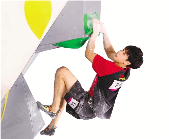 8月3日,首次成为奥运会正式比赛项目的攀岩在东京青海城市运动公园迎来首秀。图为中国选手潘愚非在男子全能预赛中。