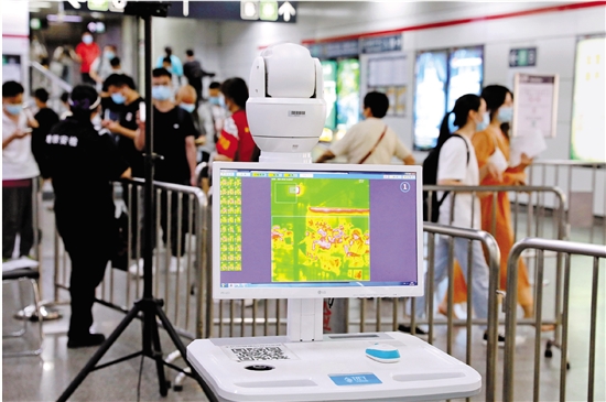8月4日,地铁杭州东站站入口,工作人员对乘客进行红外测温。 本报记者 李震宇 魏志阳 摄