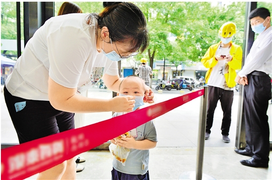 杭州一家商场门口,一位小顾客没有戴口罩,保安提供免费口罩,家长为孩子戴上后才进入商场。