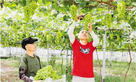 近日,浙江嘉农农业发展有限公司200余亩阳光玫瑰葡萄即将上市。该公司采用智能化管控系统提升效率,点点手机就能操控大棚,并通过承包形式带动周边农户增收。今年,该公司可摘葡萄120亩,预计亩产值5万元。 本报记者 魏志阳 王志杰 拍友 钮宇萍 摄 |