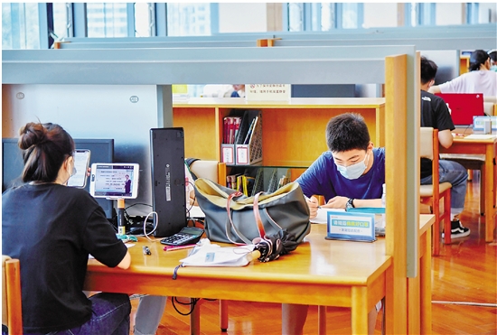 近期,杭州各大公共文化场馆采取限流、预约、错时等措施,严格验码(行程轨迹码、健康码),强化疫情防控。图为8月6日,杭州图书馆内,市民自觉佩戴口罩,安静自修。