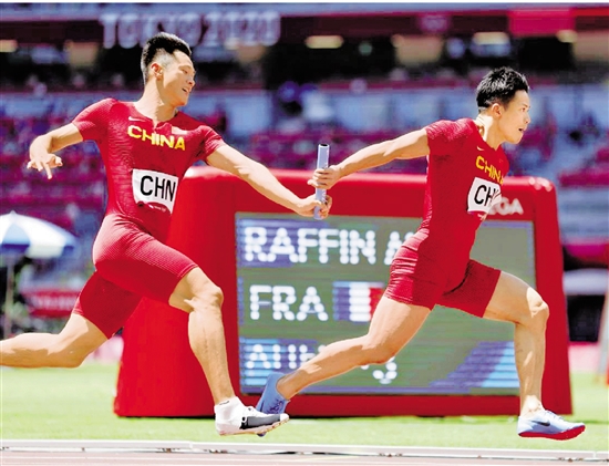 中国队队员谢震业(左)、苏炳添在比赛中。 视觉中国供图