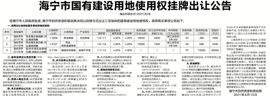 经海宁市人民政府批准,海宁市自然资源和规划局决定以挂牌方式出让三宗地块的国有建设用地使用权。现将有关事项公告如下: