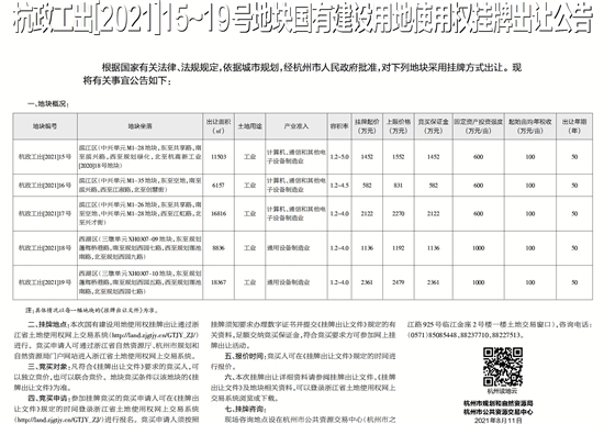 杭政工出[2021]15~19号地块国有建设用地使用权挂牌出让公告