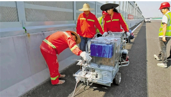 项目主线高架上,施工人员在划设标志标线。 本报记者 金燕翔 摄