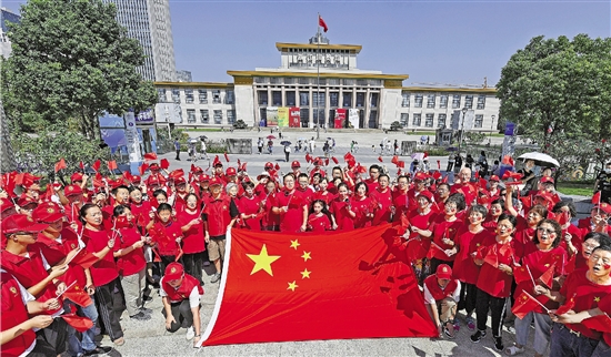 | 杭州天水街道的各界代表身穿红色T恤,在武林广场挥舞国旗,一起唱响《我和我的祖国》《歌唱祖国》,以红韵快闪的形式,庆祝新中国成立72周年,祝福祖国母亲繁荣富强。 本报记者 林云龙 王逸群 共享联盟拱墅站 张婷婷 柳景春 摄 |