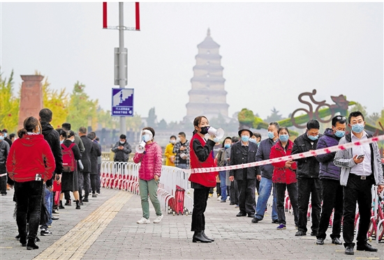 10月19日,西安市雁塔北路一核酸检测点,市民在社区工作人员的引导下有序进行核酸检测。 新华社记者 刘潇 摄