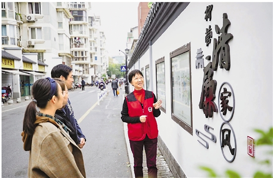 | 近日,走进杭州市拱墅区长庆街道柳营社区,街巷两旁的墙绘焕然一新,讲述廉政历史故事,展示廉洁家风家训。今年4月起,长庆街道柳营社区结合老旧小区改造项目,打造清廉文化街区,将廉洁文化渗透街头巷尾。图为柳营社区老党员凌志英向青年居民讲述清廉好家风故事。 本报记者 姚颖康 拍友 何婕妤 摄 |