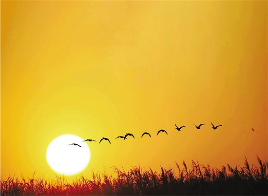 夕阳下,绿头鸭和斑嘴鸭在海涂上空自由地飞翔。