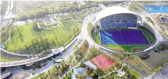 11月10日,杭州城北的运河亚运公园尚未正式开放,周边居民已迫不及待前来活动筋骨。这里是2022年杭州亚运会乒乓球、曲棍球与霹雳舞的竞技场,除了“杭州伞”与国球中心两大场馆,还设置了全民健身及休闲场地。 本报记者 潘海松 摄