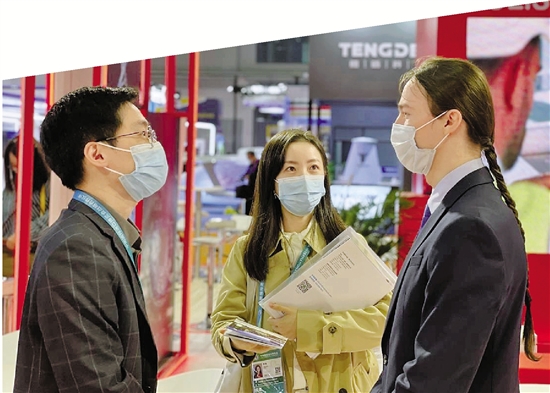 宁波中东欧创新基地工作人员(左一、左二)与进博会参展商展开项目交流。
